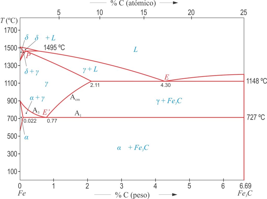 Este diagrama es una herramienta gráfica fundamental que nos permite visualizar las fases de equilibrio (o equilibrio metaestable) que se forman en el acero para diferentes combinaciones de concentración de carbono y temperatura. Aunque existe un diagrama de equilibrio estable (hierro-grafito), el diagrama metaestable es de mayor interés práctico, ya que la condición estable solo se alcanza con enfriamientos extremadamente lentos, lo cual rara vez ocurre en los procesos de fabricación industriales, especialmente en rangos de baja temperatura y bajo contenido de carbono.