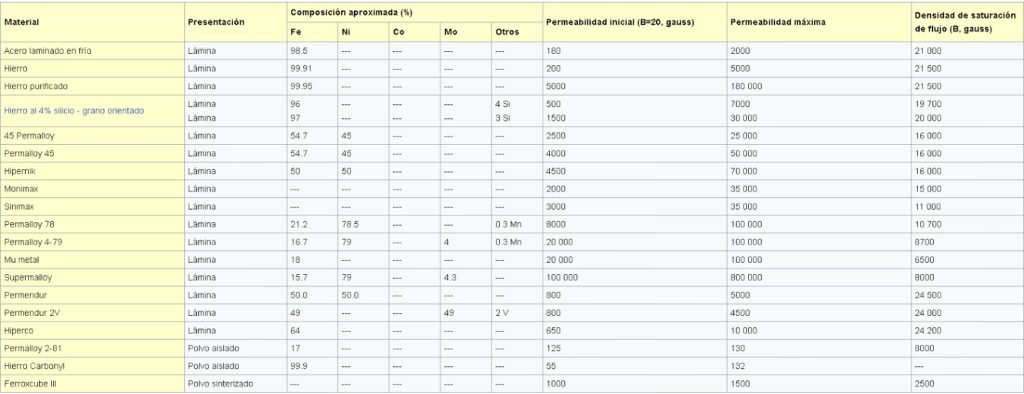 | Cobalto-hierro | 2.3 x 10⁻² | 18000 |