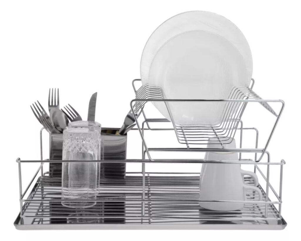 La principal ventaja de estos escurridores es su vasta capacidad de almacenamiento, permitiendo organizar platos, cuencos, vasos y cubiertos en diferentes niveles. El aspecto a considerar es que, al depender de una estructura robusta para soportar el peso de varios niveles de trastes, suelen estar hechos de acero inoxidable o metal cromado, lo que los hace más pesados, con un peso que supera los 2 kilogramos.