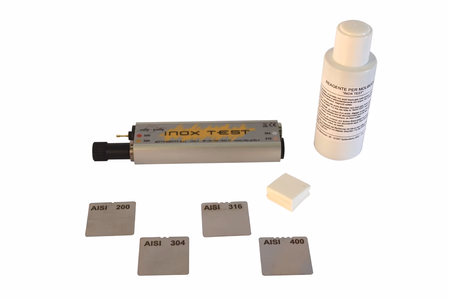 Inox Test reconoce las aleaciones de acero inoxidable mediante un test electroquímico y algunas pruebas sencillas y rápidas: Prueba para determinar la presencia de molibdeno y diferenciar un acero inoxidable de serie AISI 300 de un acero inoxidable de serie AISI 316. ¿más información?